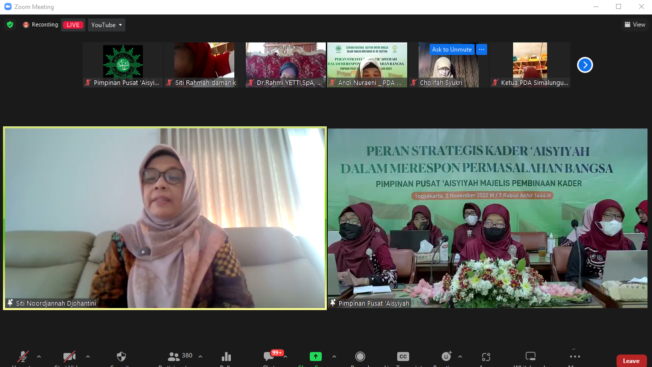 “Kalau kita berbicara peran ‘Aisyiyah dan peran kader-kader ‘Aisyiyah, maka kader adalah orang-orang yang terpilih yang harus mampu melakukan apa saja yang tidak bisa dilakukan pemimpin sebelumnya untuk menggerakkan organisasi menjadi yang terdepan yang tidak bisa dilakukan pemimpinan sebelumnya, ini tidak sederhana.” Hal tersebut disampaikan oleh Ketua Umum Pimpinan Pusat ‘Aisyiyah, Siti Noordjannah Djohantini dalam Seminar Nasional ‘Aisyiyah untuk Bangsa dalam Rangka Muktamar 48 ‘Aisyiyah bertema “Peran Strategis Kader ‘Aisyiyah dalam Merespon Permasalahan Bangsa”pada Rabu (2/11/22).