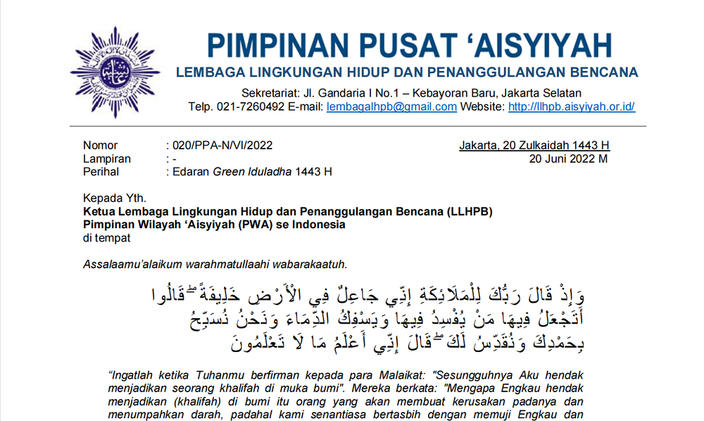 Menyambut Iduladha 1443H, Lembaga Lingkungan Hidup dan Penanggulangan Bencana (LLHPB) Pimpinan Pusat (PP) ‘Aisyiyah mendorong diterapkannya Green Iduladha dengan mensosialisasikan pengurangan penggunaan kantong plastik sekali pakai. Dorongan ini tercantum dalam surat Edaran Green Iduladha 1443 H tertanggal 20 Juni 2022.